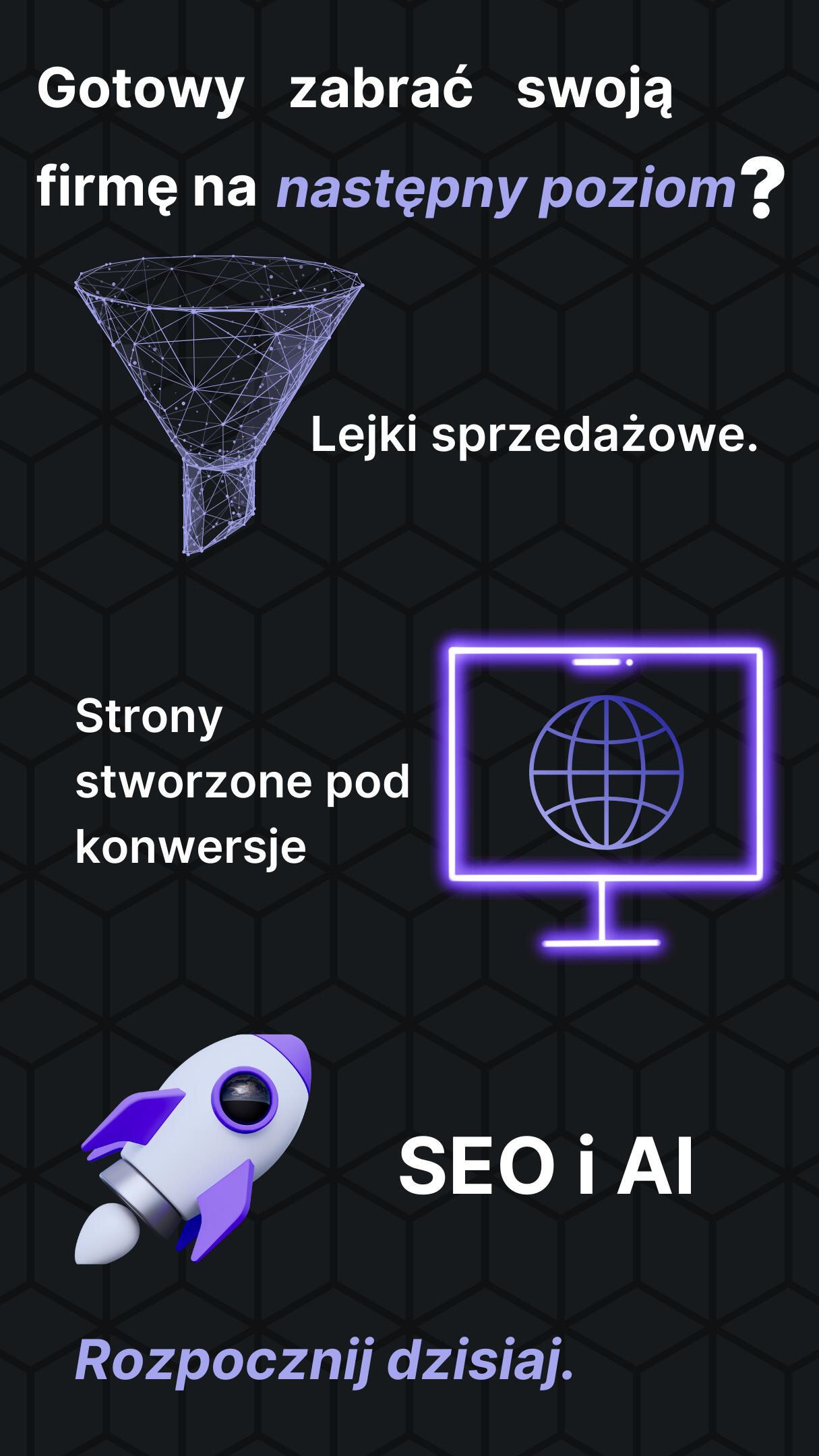 Tworzymy strony internetowe, optymalizujemy ruch, wdrażamy zaawansowane rozwiązania AI i budujemy zautomatyzowane lejki sprzedażowe, aby rozwijać Twój biznes.